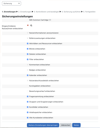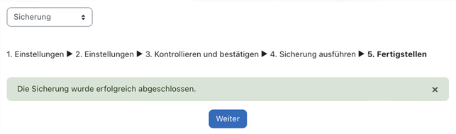 Gehen Sie wie oben beschrieben in Ihrem Kurs zum Abschnitt Sicherung und klicken Sie auf Weiter.