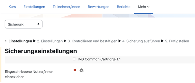 Damit Sie einen Kurs für eine andere Klasse in einem anderen Kurs oder auf einem anderen Moodle weiterverwenden können, ist es wichtig, dass keine Daten von Nutzerinnen und Nutzern mitgesichert werden. Daher ist diese Option nicht verfügbar.