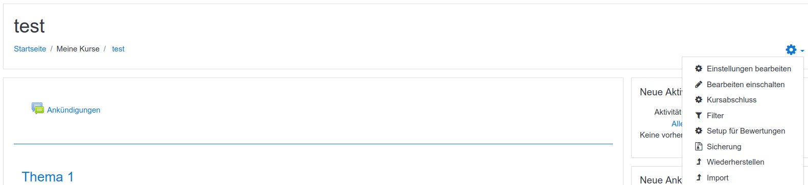 - Navigieren Sie als Trainer in Ihrem Kurs rechts oben über das Zahnradmenü zu Wiederherstellen