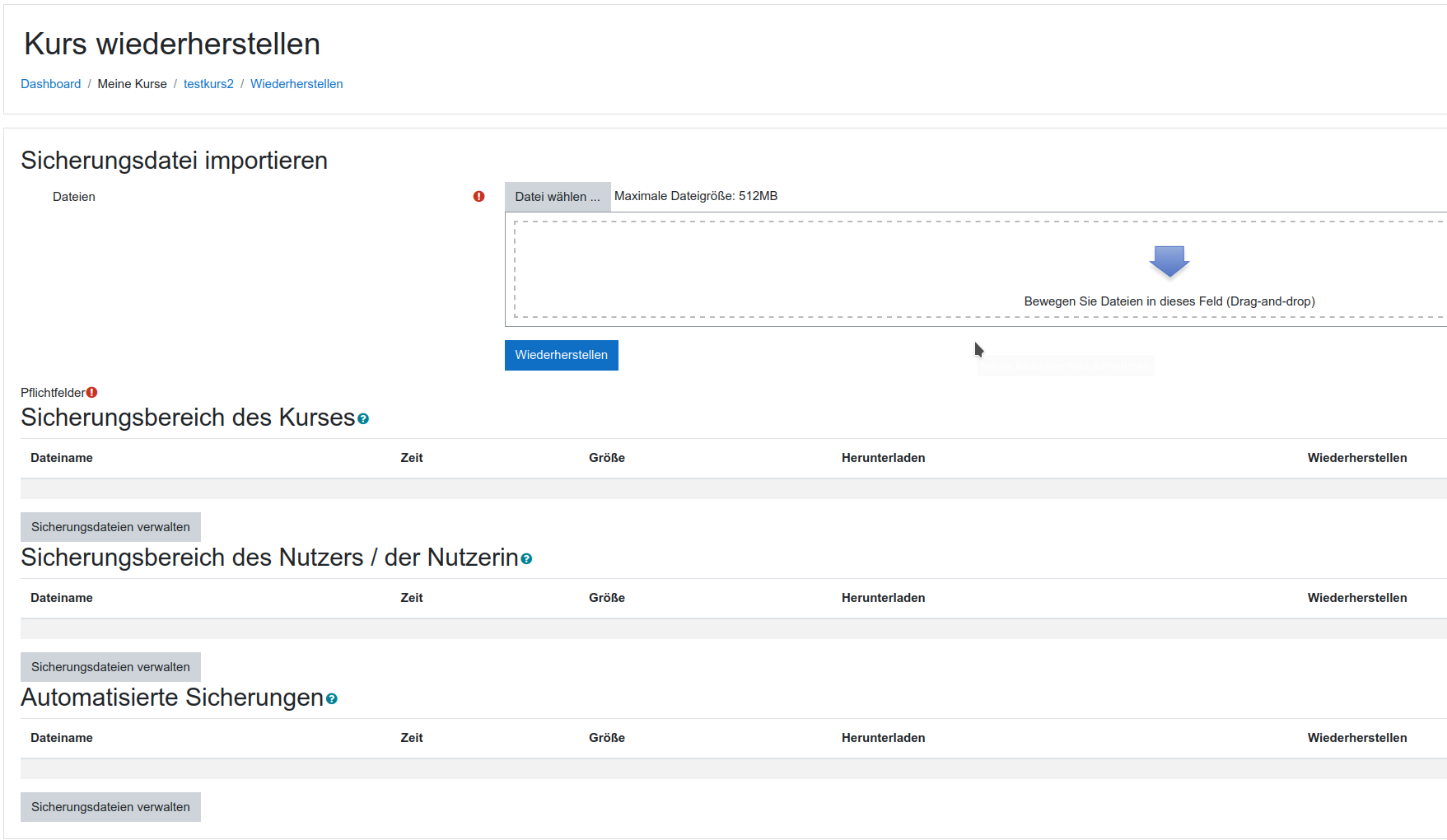 - Eine Kurssicherung, die Sie in Ihrem Kurs in der Vergangenheit erstellt haben, finden Sie im Sicherungsbereich des Kurses. Diese Sicherungen enthalten alle Daten des Kurses inklusive der Nutzerdaten.