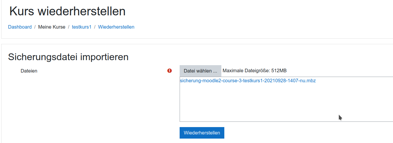 - Holen Sie die Datei mit der Kurssicherung (.mbz) über bekannte Vorgehensweisen (Datei wählen oder Ziehen und Fallenlassen) in das Fenster bei Sicherungsdatei importieren und wählen Sie Wiederherstellen.