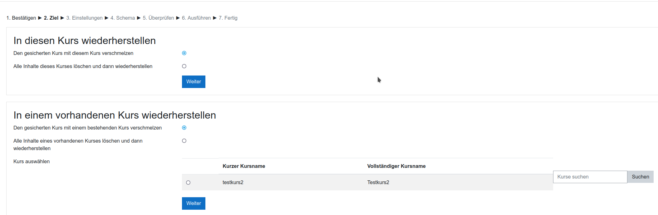 - Im Beispiel befinden Sie sich schon im richtigen Kurskontext. Entscheiden Sie sich, ob Sie im Bereich In diesem Kurs wiederherstellen vorhandene Lernmaterialien oder Aktivitäten, die im Kurs vorhanden sind, erhalten wollen (Verschmelzen) oder ob Sie vor der Wiederherstellung alles löschen wollen.