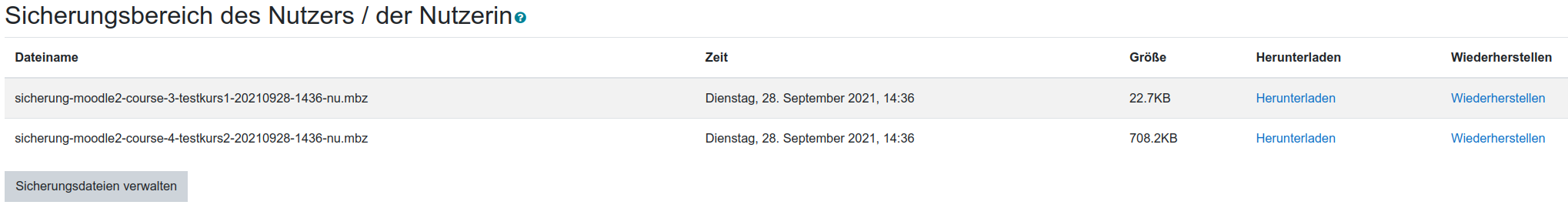 - Im Sicherungsbereich des Nutzers / der Nutzerin finden Sie Sicherungen ohne Nutzerdaten, die Sie als Trainer von den Kursen auf Ihrem Moodle erstellt haben.