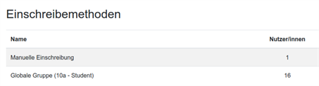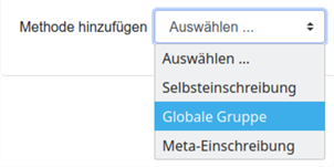 Hinweis: Die Einschreibung Globaler Gruppen ist nur möglich, wenn der Administrator die dazugehörige Einschreibemethode aktiviert hat und Globale Gruppen mit den dazugehörigen Nutzerinnen und Nutzern vom Administrator eingerichtet wurden.
