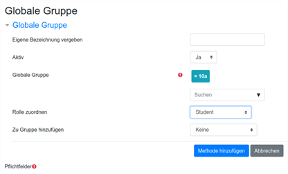 - Die ausgewählte Globale Gruppe wird angezeigt. Prüfen Sie noch, ob im Feld Rolle zuordnen die Option Student (bzw. Teilnehmer) ausgewählt ist und wählen Sie Methode hinzufügen.