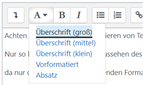 Achten Sie darauf, beim Formatieren von Texten die im Editor vorhandenen Formatvorlagen anzuwenden. Nur so kann ein einheitliches Aussehen des Kursraumes gewährleistet werden, da nur dann die auf CSS basierenden Formate des Themes angewendet werden.