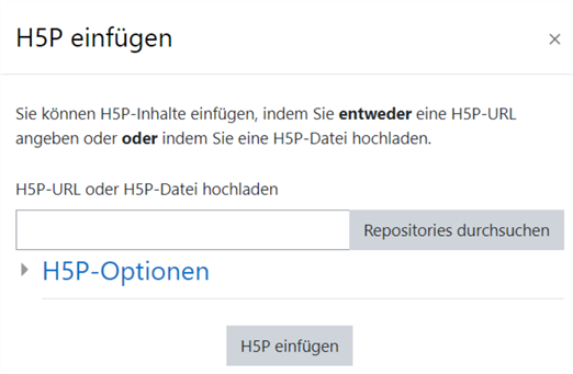 Nach anwählen können sie h5p Inhalte über den Inhaltsspeicher oder einen direkten Uplaod einbinden.