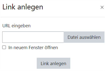Unter einem Link versteht Moodle alles was auf ein anderes Ziel verweist. Geläufig ist der Verweis auf ein Ziel im Web, ein sogenannter Web-Link. Wollen Sie einen Web-Link anlegen kopieren sie die URL in das Feld URL eingeben. Hier können Sie entscheiden, ob der Link sich in einem neuem Fenster öffnen soll oder nicht.