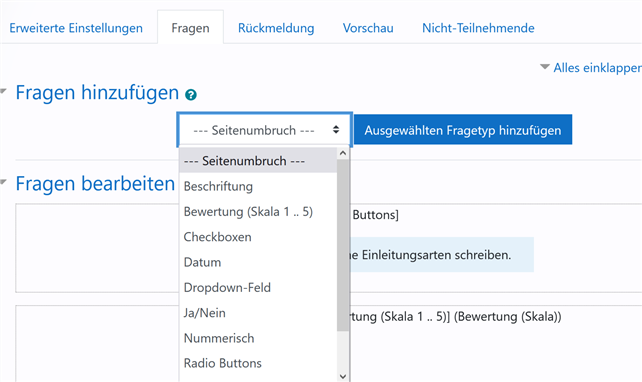 Mit der Befragung lassen sich umfangreiche Fragebögen mit den unterschiedlichsten Fragetypen gestalten. Diese Aktivität ist für die Evaluation prädestiniert und ist etwas komfortabler als die Befragung. Außerdem lassen sich Fragebögen exportieren oder für die gesamte Moodle-Installation zur Verfügung stellen.