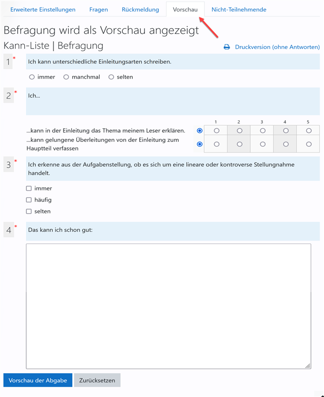 • Mit Hilfe der Registerkarte Vorschau können Sie sich jederzeit ansehen, wie Ihre erstellten Fragen aus Sicht der Schüler:innen aussehen. Außerdem können Sie sich eine Druckversion Ihrer Befragung ausgeben lassen.