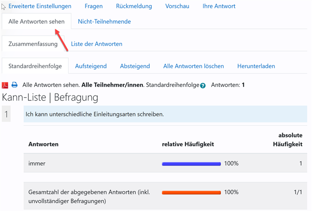 • Sobald Schüler:innen die Befragung ausgefüllt haben, können Sie sich die Antworten sehr detailliert ansehen und herunterladen.