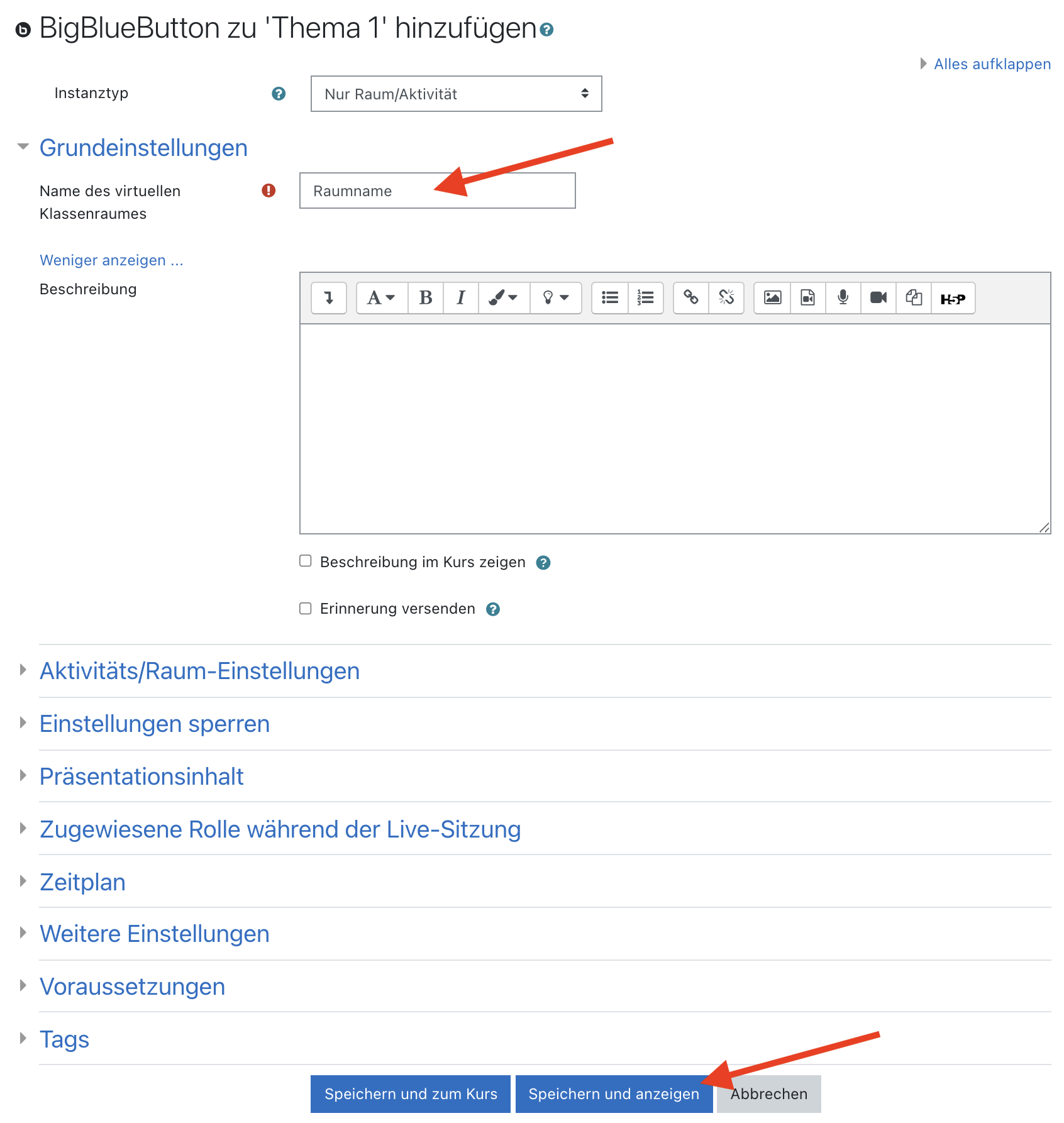 Vergeben Sie einen Raumnamen und klicken Sie auf Speichern und anzeigen, um BigBlueButton sofort verwenden zu können.
