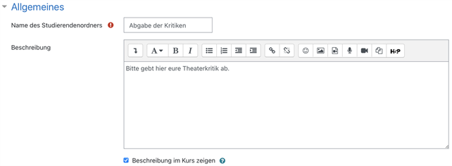 Geben Sie dem Ordner einen passenden Namen. Im gezeigten Beispiel sollen Texte einer Theaterkritik abgegeben werden.