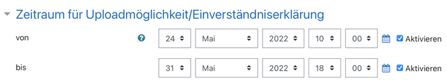 Entscheiden Sie anschließend, ob Sie einen Zeitraum für die Abgabe setzen möchten. Falls dies nicht gewünscht ist, deaktivieren Sie den Zeitraum, indem Sie einmal in die Kästchen Aktivieren klicken.