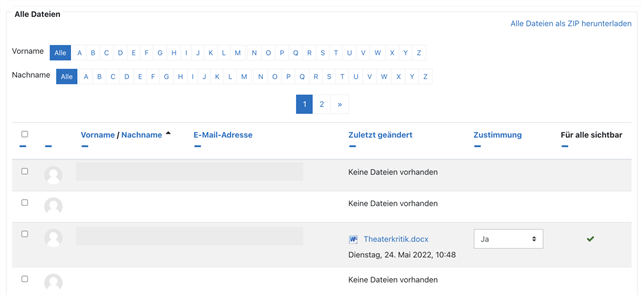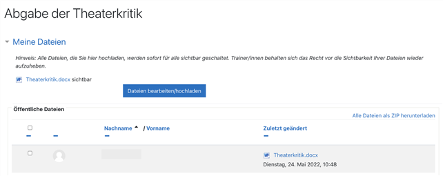 In der Ansicht der Lehrkraft werden alle hochgeladenen Dateien sichtbar, ebenso wie für die Lernenden. Möchte man die Zustimmung für die Datei entziehen, sodass diese für die Lernenden nicht (mehr) sichtbar ist, kann man bei Zustimmung von ja auf nein umstellen.