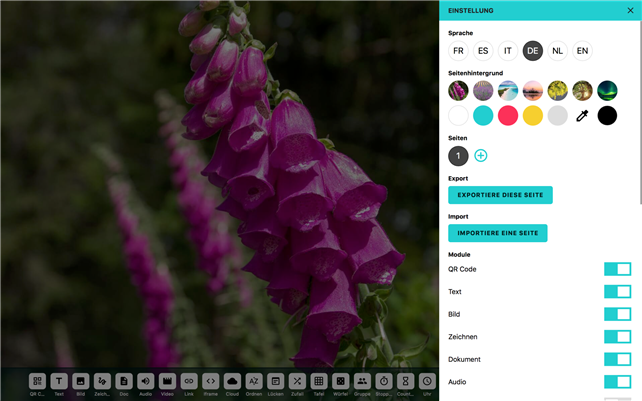 Tipp: Mit einem Reload der Seite und somit des digiscreens werden sämtliche Einstellungen zurückgesetzt. Wenn Sie einen digiscreen zuhause vorbereiten möchten, um diesen im Unterricht zu nutzen, muss dieser unbedingt exportiert und vor dem Unterricht importiert werden. Darüber hinaus ist es aus technischer und didaktischer Sicht stets empfehlenswert, den Vollbildmodus zu nutzen.