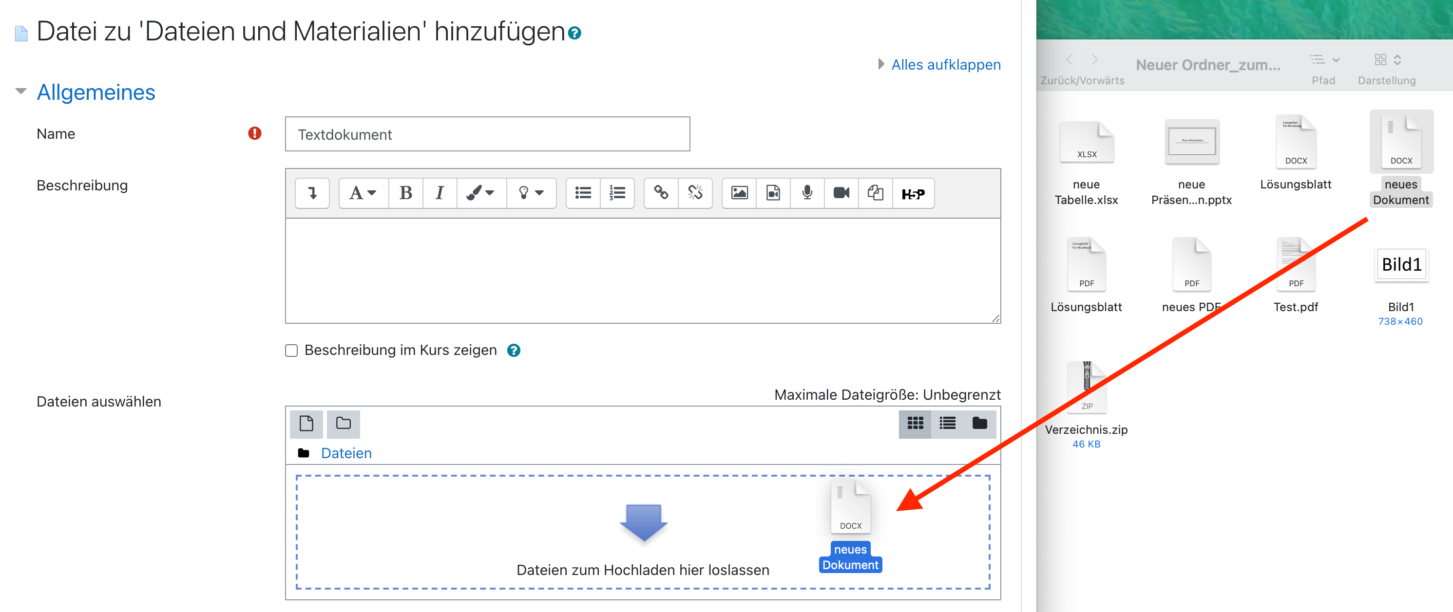 Moodle bietet Ihnen natürlich auch die Möglichkeit, eine Datei per drag & drop im Kurs einzustellen. Wie das geht, erfahren Sie hier.