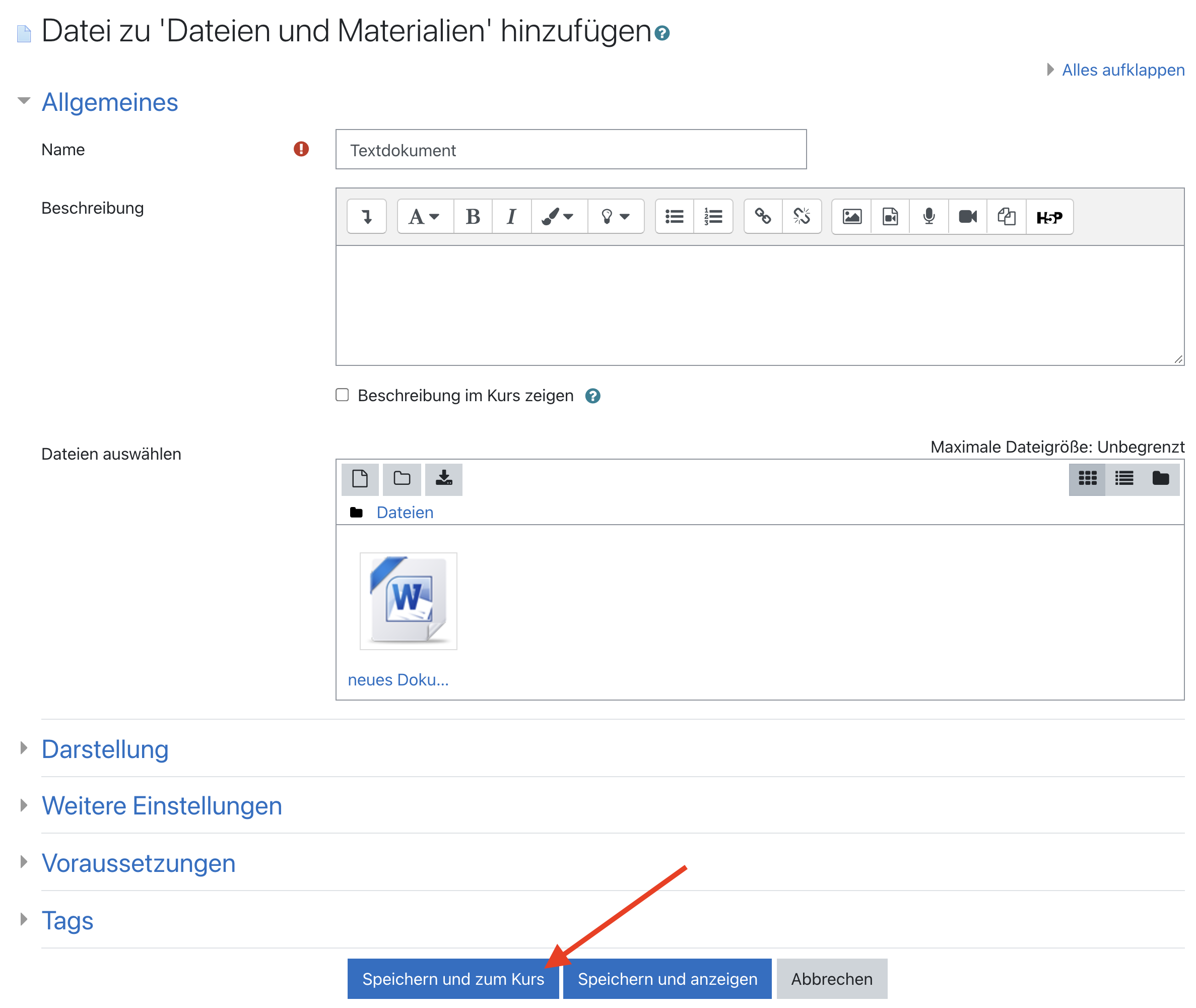 Sobald Sie auf Speichern und zum Kurs klicken, ist die Datei in Ihrem Moodlekurs verfügbar.