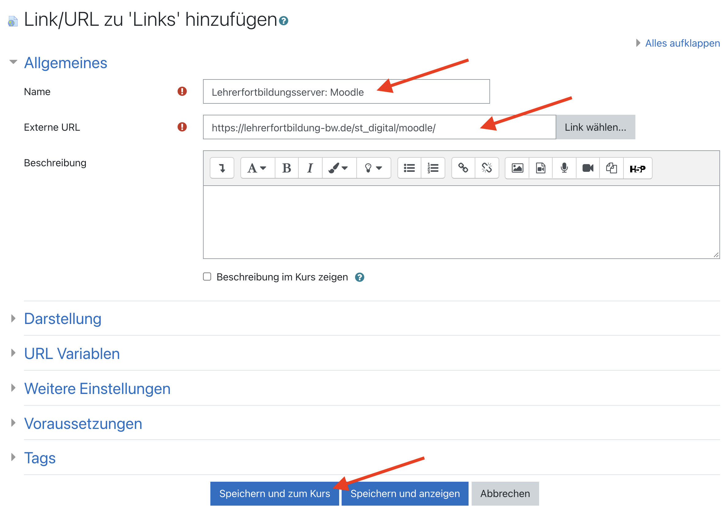 Geben Sie dem Link den gewünschten Namen und fügen Sie die URL ein, zu der der Link führen soll. Sobald Sie auf Speichern und anzeigen klicken, wird der Link Ihrem Moodlekurs hinzugefügt.