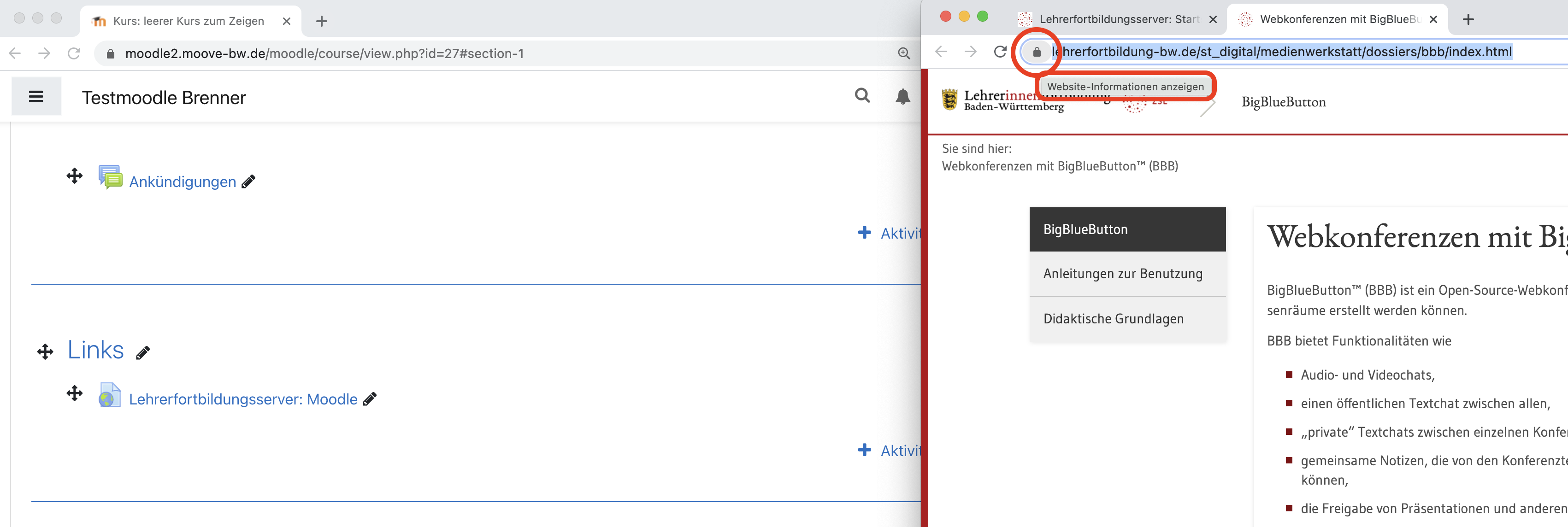 Öffnen Sie dazu neben Ihrem Moodlekurs ein weiteres Fenster mit der Seite, die Sie im Kurs verlinken möchten. Dabei spielt es keine Rolle, welchen Browser Sie verwenden. N avigieren Sie mit Ihrer Maus in den Bereich vor der URL, in dem Sie sich die Website-Informationen anzeigen lassen können.