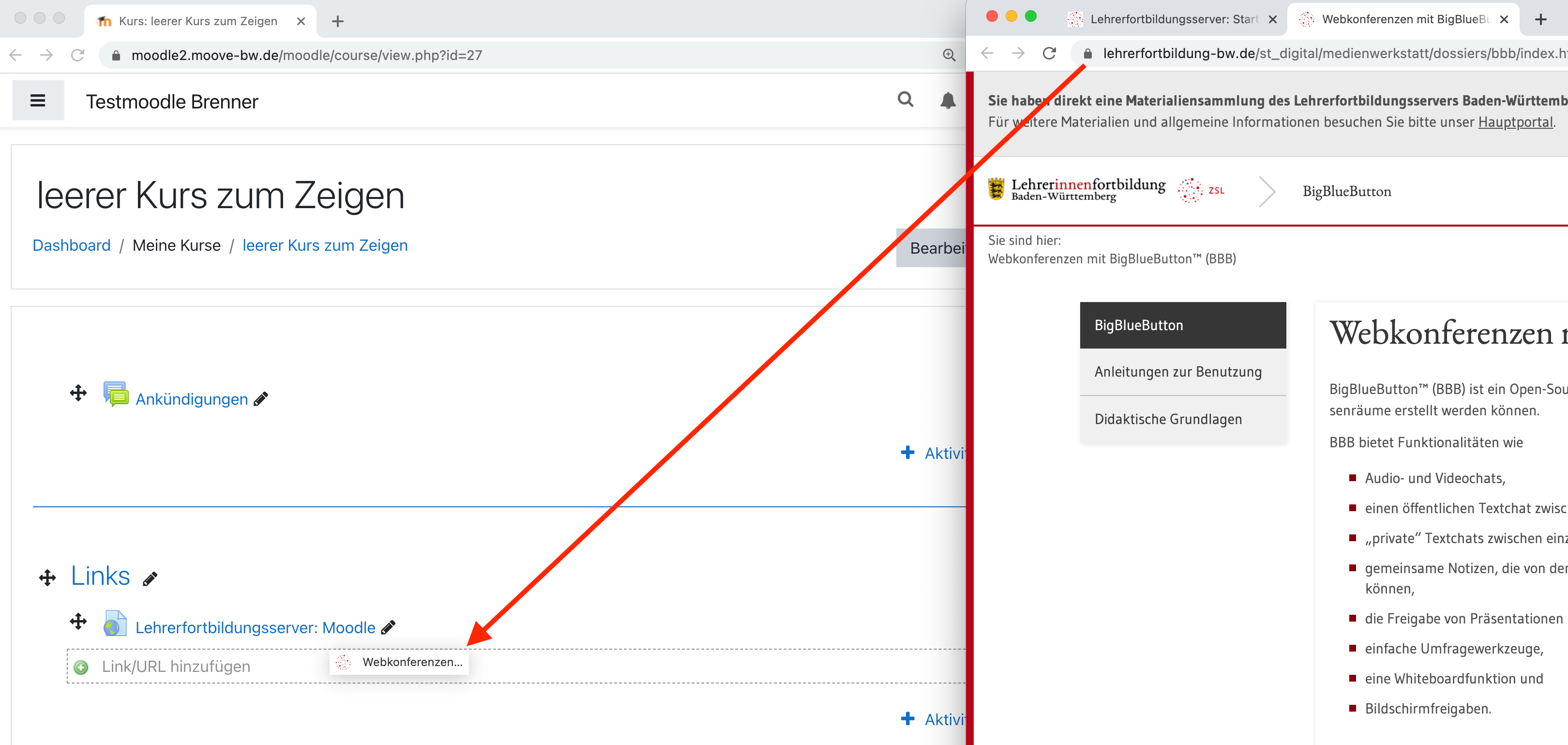Sofern Ihr/e Administrator/in diese Einstellung in den experimentellen Einstellungen ermöglicht hat, können Sie Links ganz einfach auch per drag & drop in Ihren Kursraum hineinziehen.