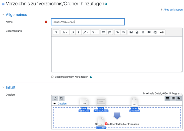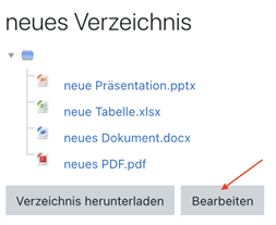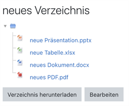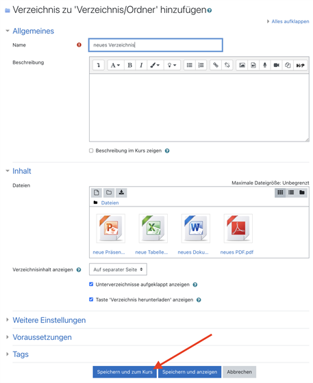 Klicken Sie auf Speichern und zum Kurs, wenn Sie alle Dateien für dieses Verzeichnis hinzugefügt haben. Das Verzeichnis wird dann in Ihrem Moodlekurs angezeigt.