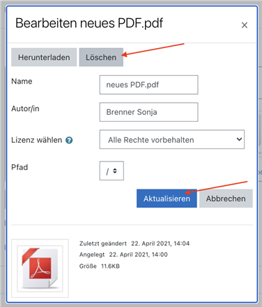 Um eine Datei aus dem Verzeichnis zu löschen, wählen Sie diese Datei aus. Es öffnet sich ein neues Fenster, in welchem Sie die Datei löschen und das Verzeichnis aktualisieren können.