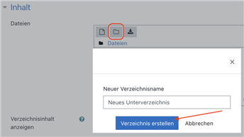 Um ein Unterverzeichnis anzulegen, klicken Sie im Abschnitt Inhalt auf das Ordner-Symbol und geben dem Verzeichnis einen Namen. Sobald sie auf Verzeichnis erstellen klicken, wird dieses angelegt.