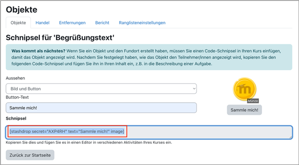 Nun können Sie das Aussehen des Objekts bestimmen und den Button-Text festlegen. In diesem Beispiel wurde der Button-Text von „Pick me!“ zu „Sammle mich!“ geändert. Anschließend kopieren Sie den Code in Ihre Zwischenablage. Diesen benötigen Sie, um das Objekt am gewünschten Fundort im Kurs zu platzieren. Klicken Sie auf Zurück zur Startseite.