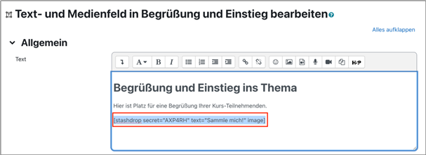 Nachdem Sie alle oben beschriebenen Einstellungen vorgenommen haben, können Sie das Objekt an der gewünschten Stelle im Kurs platzieren. Das ist überall dort möglich, wo Ihnen der Texteditor zur Verfügung steht.