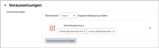 Im Bereich Voraussetzungen können Sie nun die gewünschte Voraussetzung erstellen. In diesem Beispiel muss der Teilnehmende die vorherige Aktivität abgeschlossen haben. Achten Sie außerdem darauf, dass Sie bei den Voraussetzungen die Sichtbarkeit deaktivieren (durchgestrichenes Auge).