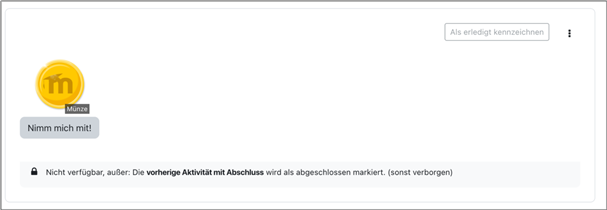 Achtung: Für dieses Beispiel muss der Aktivitätsabschluss im Kurs aktiviert sein. (vgl. ggfs. https://docs.moodle.org/405/de/Aktivit%C3%A4tsabschluss)