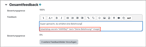 In diesem Beispiel wird die Aktivität Test genutzt. Der Bearbeitungsmodus ist aktiviert und Sie befinden sich in den Einstellungen der Aktivität Test. Im Bereich Gesamtfeedback kann nun eine Rückmeldung für die Teilnehmenden formuliert, beziehungsweise der zu diesem Fundort passende Code für das Objekt platziert werden.