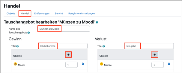 Im Bereich Verlust können Sie über das Plus-Symbol das Objekt auswählen, welches die Teilnehmenden dafür abgeben (in unserem Beispiel: drei Münzen).
