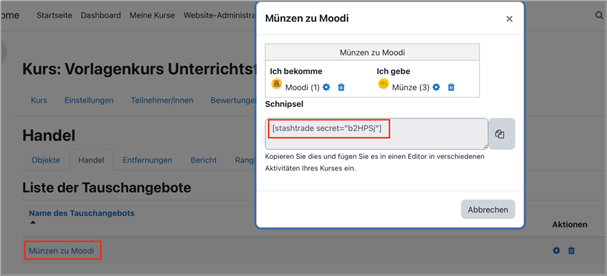 Klicken Sie auf den Titel eines Tauschangebots und kopieren Sie sich den entsprechenden Code. Diesen können Sie nun in Ihrem Kurs platzieren, zum Beispiel in einem Textfeld in der Blockleiste.