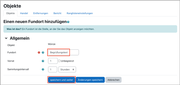 Ist der Vorrat auf 1 gestellt, bedeutet das, dass der Teilnehmende dieses Objekt nur einmalig an dem von Ihnen festgelegten Fundort einsammeln kann. Falls Sie bei Vorrat unbegrenzt auswählen, können Sie ein Sammlungsintervall einstellen (z.B. alle 24 Stunden). Klicken Sie auf speichern und weiter.