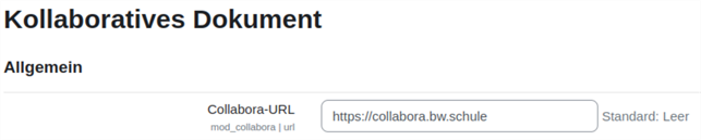 Navigieren Sie als Administrator:in zum Menüpunkt „Website-Administration – Plugins – Aktivitäten“ und rechts neben „Kollaboratives Dokument“ auf Einstellungen. Dort muss folgende Adresse eingetragen sein – wenn nicht bitte eintragen und speichern: