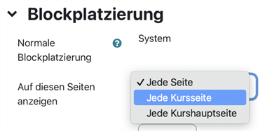 Wechseln Sie in einen beliebigen Kursraum und gehen Sie auch hier über das Einstellungssymbol und Konfigurieren ins Konfigurationsmenü des Blockes. Ändern Sie unter „Auf diesen Seiten anzeigen“ die Einstellung auf „Jede Kursseite“.