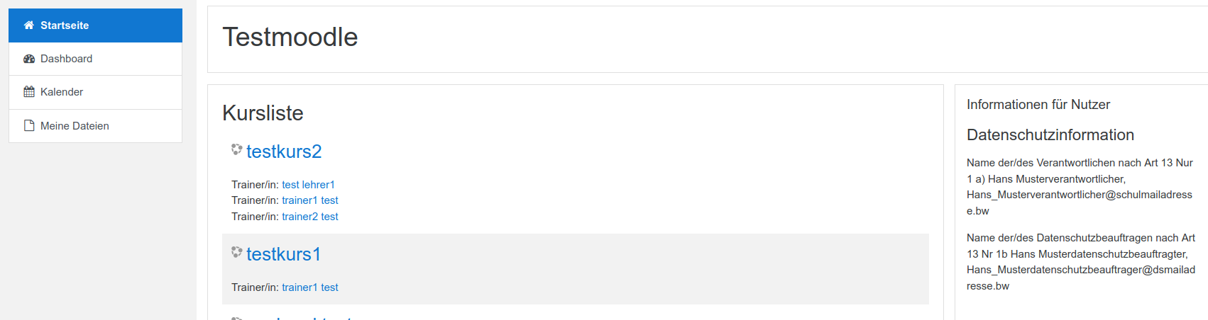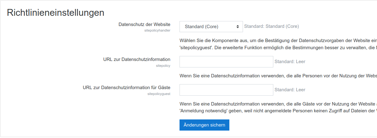 Da das Moodlesystem in Hintergrund jede Menge personenbezogener Daten speichert, ist man verpflichtet, die Nutzer darüber in Kenntnis zu setzen. Hierzu dient ein Dokument, das jedem Nutzer gezeigt wird, wenn er sich zum ersten Mal an der Moodleinstanz anmeldet. Der Nutzer muss die Kenntnisnahme dieses Dokuments bestätigen. Im Verzeichnissystem des Servers bei Belwue, liegt im Verzeichnis Moodle schon eine allgemeingültige Vorlage (als pdf), auf die Sie durch die Eingabe eines Pfades in der Moodlekonfiguration verlinken können. Allerdings müssen Sie der Vollständigkeit halber auf der Startseite / Dashboard einen Textblock integrieren, in dem die/der Verantwortliche und die/der Datenschutzbeauftragte mit Namen und E-Mail Adresse genannt werden.