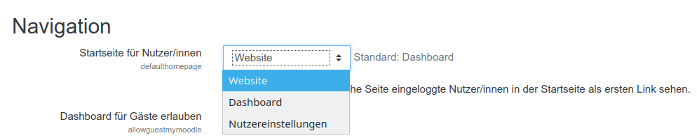 - Wählen Sie im Pulldown Menu hinter Startseite für Nutzer/innen die gewünschte Option.