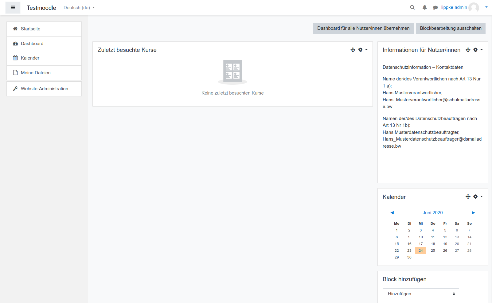 - Passen Sie das Aussehen des standardmäßigen Dashboards nach den Erfordernissen Ihrer Schule an, indem Sie gewünschte Blöcke mit Hilfe des Blockes Block hinzufügen aktivieren oder mit Hilfe des Symbols