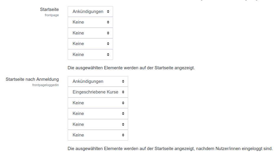 - Aufgrund der datenschutzrechtlichen Einstellungen sind nur die Parameter bei Startseite nach Anmeldung interessant. Je nach Anforderungen der Schule können hier verschiedene Möglichkeiten zur Anzeige der Kurse gewählt werden. Sinnvoll ist es die Ankündigungen, Eingeschriebene Kurse und Kurssuche zu aktivieren.