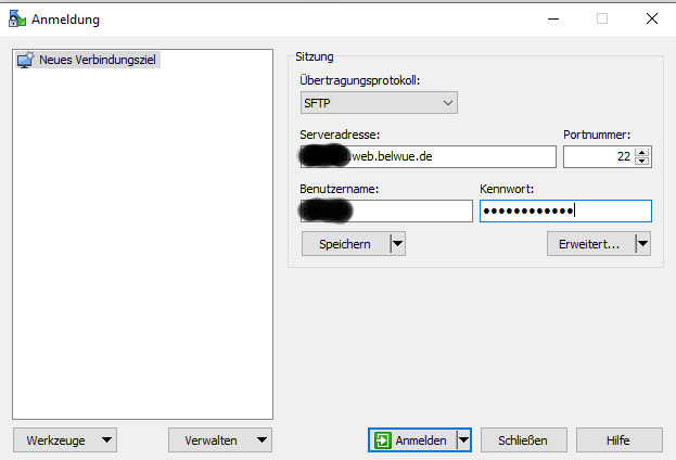 - Mit einem SCP Client Ihrer Wahl (WinSCP, FileZilla, o.ä.) können Sie sich mit den o.g. Daten auf Ihrem Server bei Belwue anmelden.