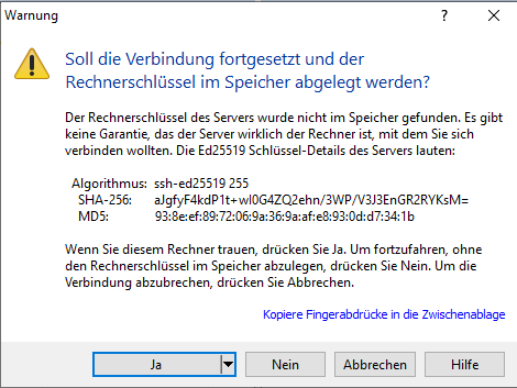 - … zeigt Ihnen dass die Sitzung gestartet wurde und im darauffolgenden Fenster müssen Sie den Rechnerschlüssel des Servers mit Ja bestätigen. (Diese Meldung erhalten Sie nur, wenn Sie sich von dem Rechner an dem Sie arbeiten zum ersten Mal anmelden.)