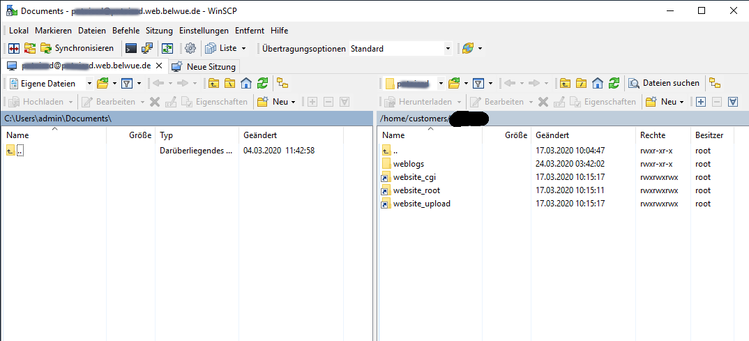 - Nun sehen Sie in der rechten Fensterhälfte das Verzeichnissystem des Servers bei Belwue, in der Linken Ihren lokalen Rechner.