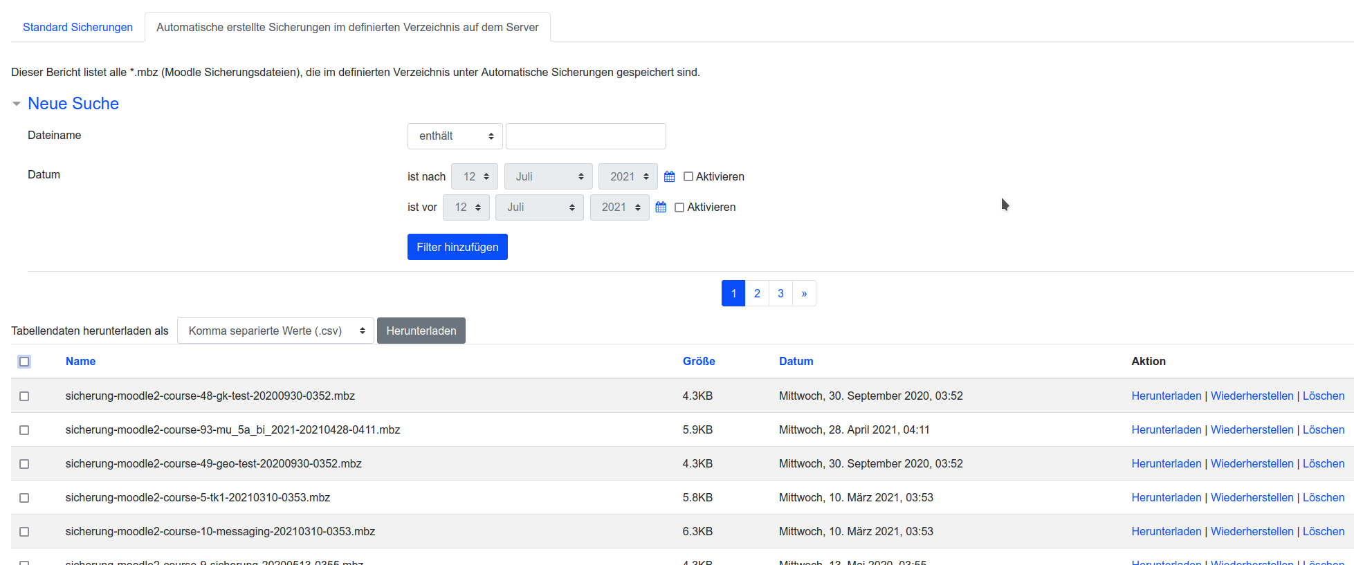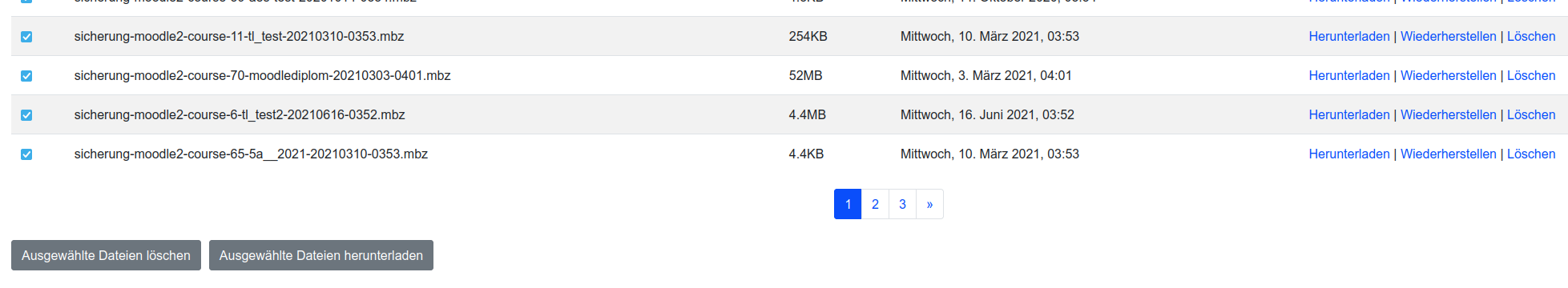 - Dort finden Sie nach dem Zeitpunkt, den Sie in der Konfiguration (s.o.) eingestellt haben die aktuellsten Sicherungen aller Kurse auf Ihrem Moodle als Dateien im Sicherungsformat mbz