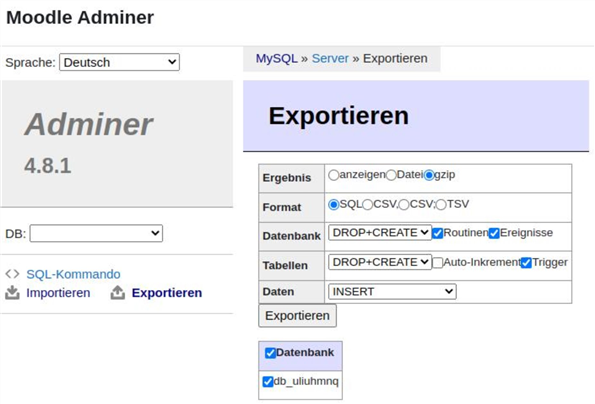 Moodle Adminer ist ein Datenbankverwaltungsprogramm, mit dem Sie Sicherungen der Moodle-Datenbank erstellen können. Die Moodle-Datenbank enthält alle Nutzer- und Konfigurationseinstellungen sowie die Kursstruktur. Die Datenbank enthält keine Dateien aus Moodlekursräumen wie PDF-Dokumente oder H5P-Aktivitäten.