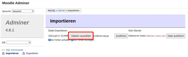 Spielen Sie eine Datenbanksicherung nur ein, wenn Sie genau wissen, was Sie tun. Sie können Ihre Moodleinstanz dadurch nachhaltig zerstören. In diesem Fall besteht kein Supportanspruch gegenüber dem Hoster.