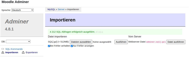 - Nach dem Klick auf Ausführen dürfen Sie auf keinen Fall nochmals auf den Button klicken, auf keinen Fall die Seite neu laden und auf keinen Fall den Browser schließen. Sie müssen Geduld haben und eventuell mehrere Minuten abwarten bis die Sicherung eingespielt wurde. Wenn Sie diesen Vorgang unterbrechen ist Ihre Moodleinstanz zerstört und nicht mehr benutzbar.