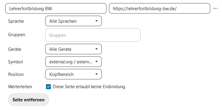 Nach der Installation findet man im Einstellungsmenü des Admins auf der linken Seite einen Menüpunkt Externe Seiten .